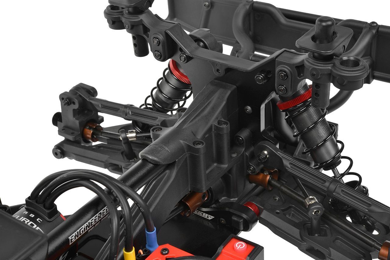Power. Control. Confidence. At the core of SHIROI lies a 3mm CNC-machined aluminum chassis, reinforced with a tower-to-tower brace and tall composite side guards. This rigid backbone is built to handle high-speed launches, rough terrain, and demanding landings with ease. A bulletproof steel drivetrain with CNC-cut gears, triple fluid-filled differentials, and durable CVD driveshafts ensures maximum efficiency and reliability on both 4S and 6S LiPo power.