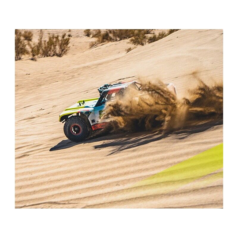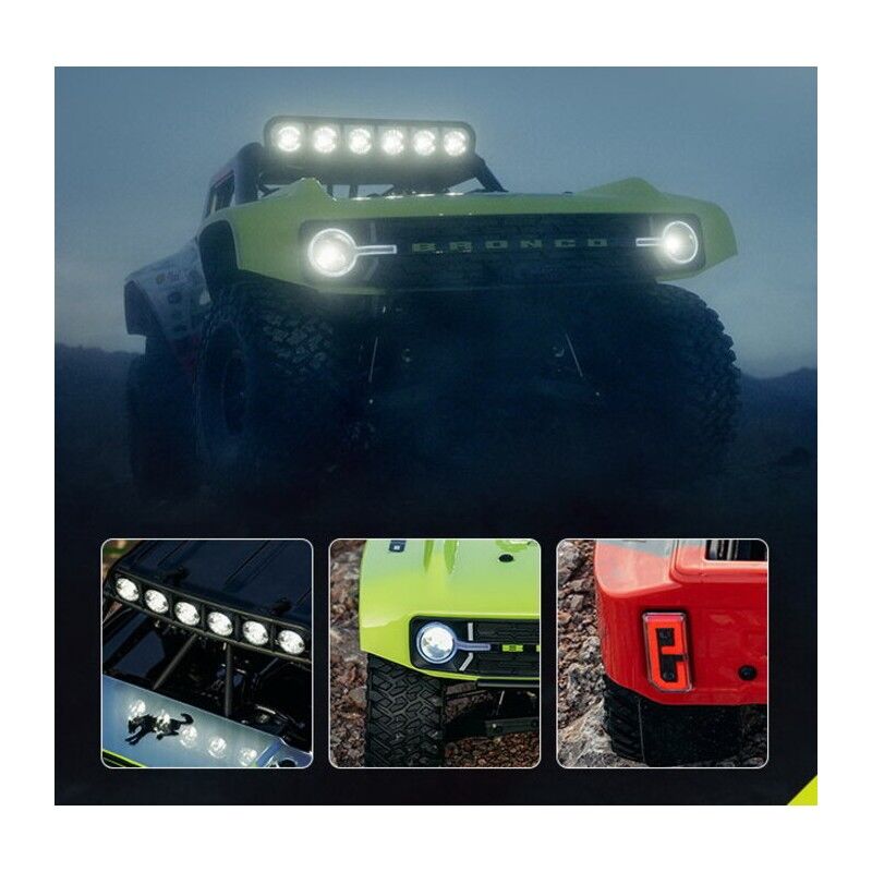 60kg servo with metal gear DUMBORC X5P7-350 2.4ghz 6 channel steering wheel radio with gyroscope DUMBORC P6DCG receiver waterproof radio box battery tray 2x3S / 6S 181x47.5mm Short Course wheels 146x55mm - red rims - 17mm hexagon Lexan FORD BRONCO "EL BANDITO" painted body + cage LED front/rear lighting